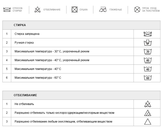 Вся система состоит из знаков: стирка, отбеливание, глажение, химчистка, машинная сушка.
